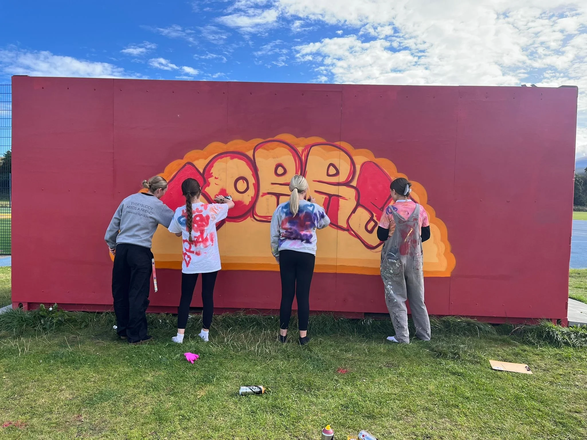 With the container securely placed and fully cladded, the project moved into its final phase: designing the exterior. Outlines Creative led a youth consultation during our last community day, gathering ideas from local young people about how they envisioned the container’s appearance. Based on their input, Outlines returned with a series of vibrant mock-up designs and collaborated with a young girls group, who have been actively involved with the Denis Law Legacy Trust, to help bring those designs to life alongside the artists.
